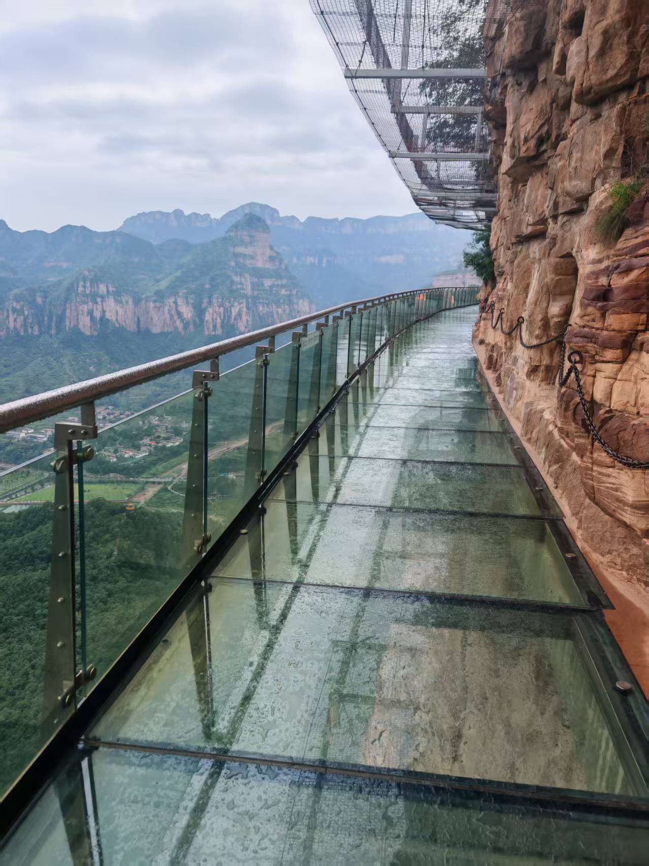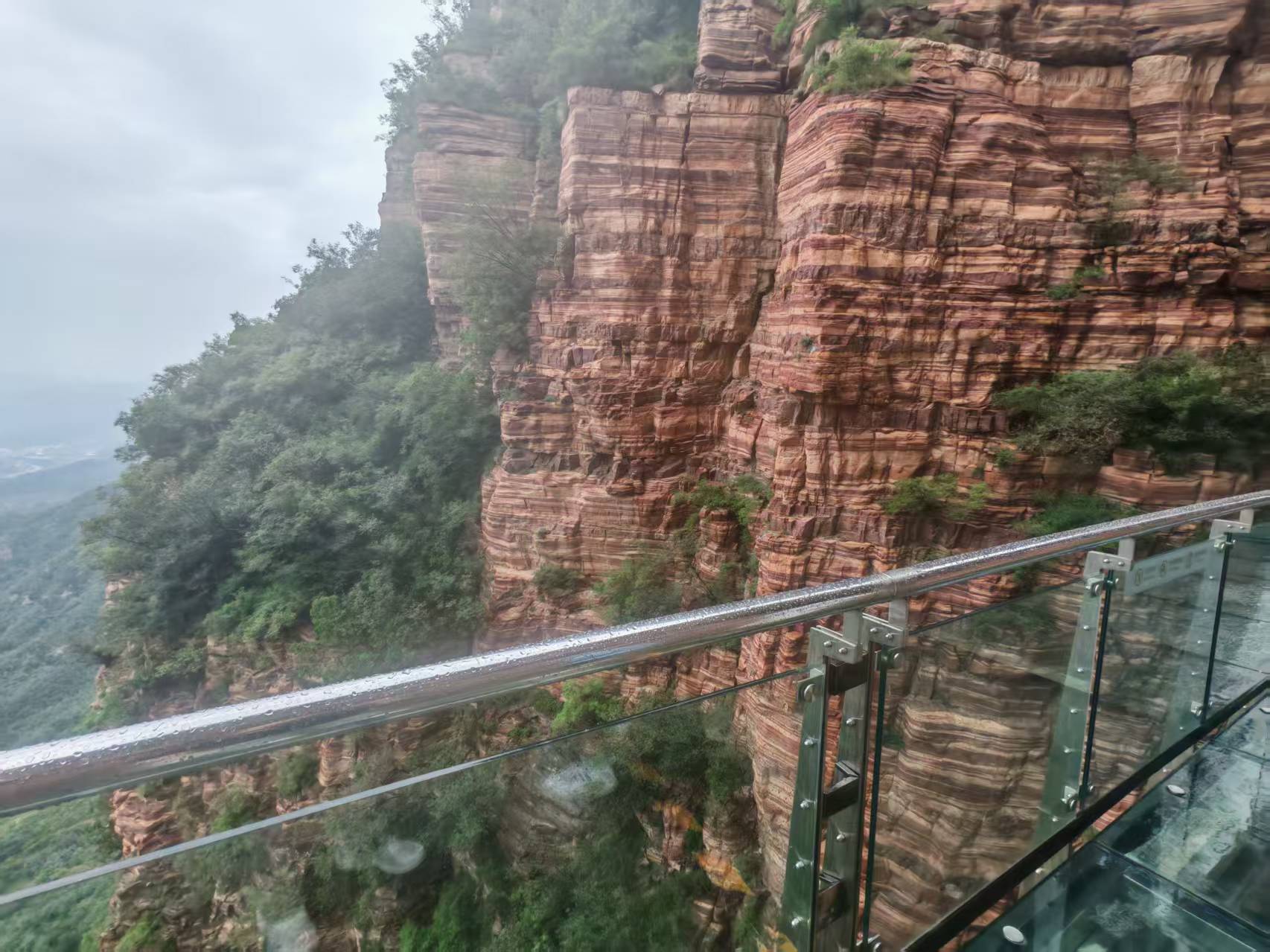 趁着雨变小了一些,我们先上了玻璃栈道,感觉这玩意是山区景点必备了。这个玻璃栈道绕山体一周,由于下了雨,玻璃上有水痕,恐怖感减小了很多(因为可以清楚感觉到自己走在玻璃上)。